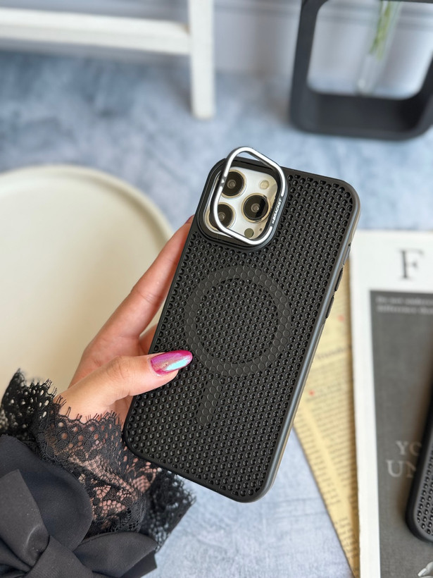 قاب Bracket با طراحی بافتدار مشکی، همراه با محافظ فلزی دور لنز و استند تاشو. مقاوم در برابر ضربه و خطوخش، انتخابی مطمئن برای حفاظت کامل آیفون.