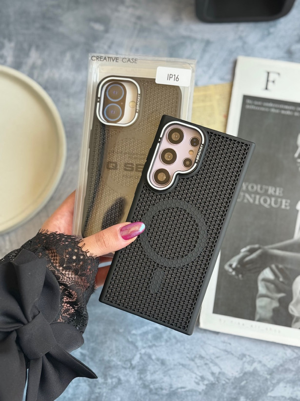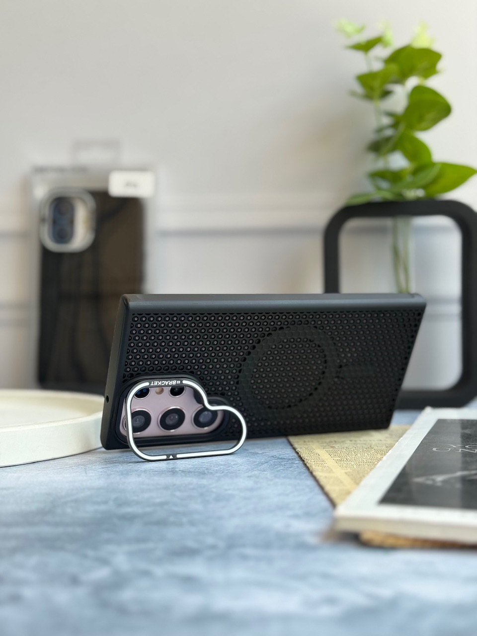 قاب Bracket با طراحی بافتدار مشکی، همراه با محافظ فلزی دور لنز و استند تاشو. مقاوم در برابر ضربه و خطوخش، انتخابی مطمئن برای حفاظت کامل سامسونگ.