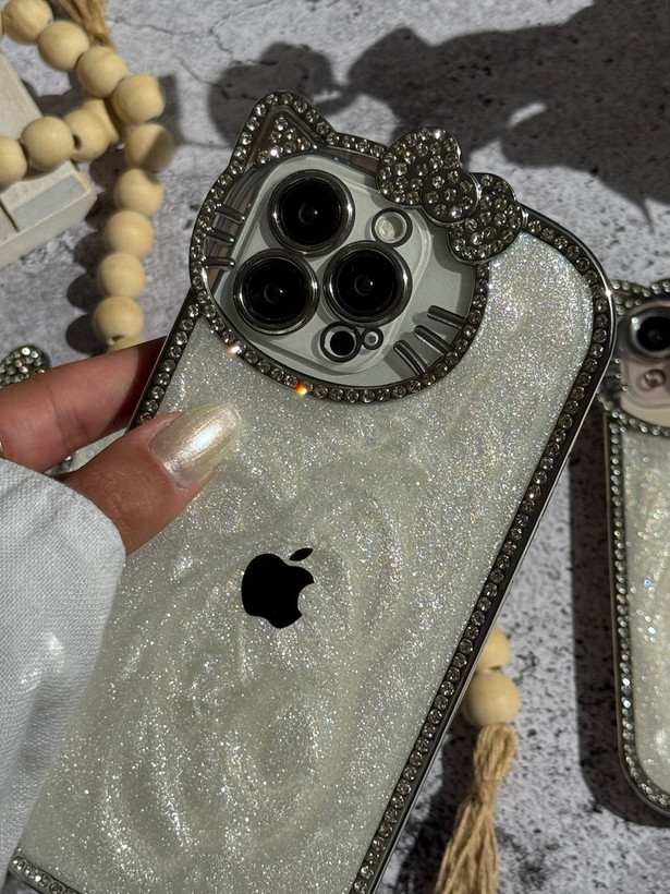 قاب رزینی Hello Kitty با طراحی لاکچری و نگینهای درخشان دور قاب و لنز. براق، مقاوم و سبک؛ مناسب برای استایل شیک و خاص.